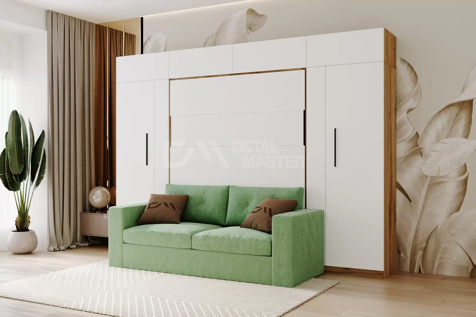 Шкаф-кровать трансформер с диваном "Deluxe platinum Balance" работает на механизме раскладывания собственной разработки "Balance". Кровать раскладывается легким движением руки, превращаясь в полноценное спальное место. Просто потяните за ножку-маятник, которая самостоятельно фиксируется в нужное положение при опускании.